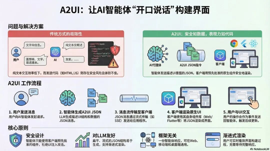 A2UI,让 AI 用 JSON 描述 UI,由客户端原生渲染交互界面。