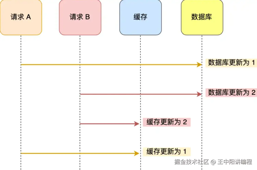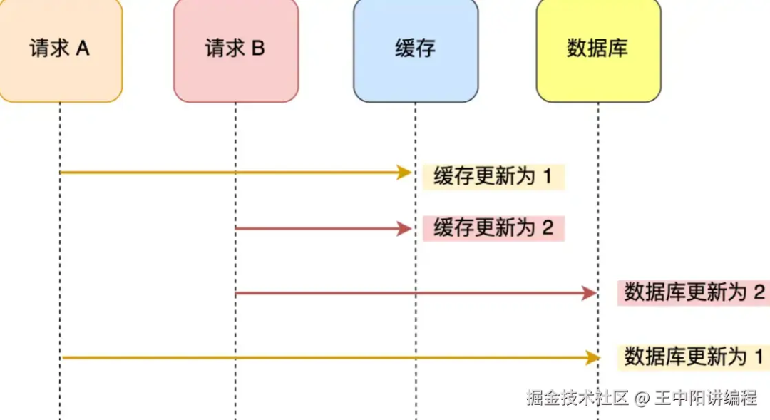 同样的分析思路,A 请求先将缓存的数据更新为 1,然后在更新数据库前,B 请求来了, 将缓存的数据更新为 2,紧接着把数据库更新为 2,然后 A 请求将数据库的数据更新为 1。 此时,数据库中的数据是 1,而缓存中的数据却是 2,出现了缓存和数据库中的数据不一致的现象。