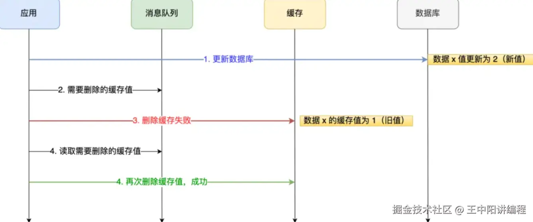 但是又有了新的问题,上述成功的前提,都是建立于这两个操作都能同时执行成功,所以问题就是,在删除缓存(第二个操作)的时候失败了,导致缓存中的数据是旧值,而数据库是最新值。