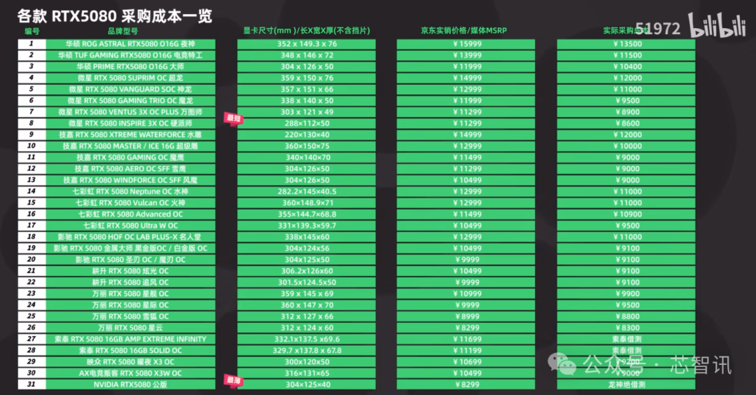 近日,B站UP主@51972 组织了一场RTX 5080显卡大型横评,一个月前就开始测试了,一共有多达31块卡参与,但都来之不易,有的是高价买的,有的是找人借的。