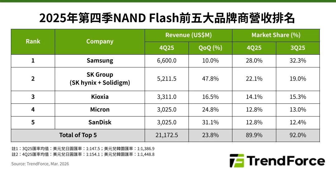 从2025年四季度主要NAND Flash厂商的表现来看,排名第一的三星电子营收为66亿美元,环比增长10%,但市占率下滑至28%。产品平均销售价格(ASP)虽明显成长,但位元出货量因前一季基数较高及制程转换损失,呈现环比下滑。