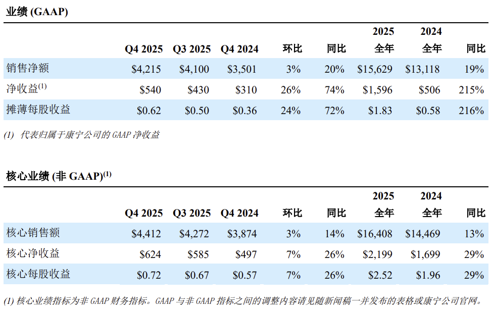 康宁执行副总裁兼首席财务官 Ed Schlesinger 表示:“2025 年,我们实现了核心销售额的双位数增长,核心每股收益的增长速度是销售额的两倍,调整后自由现金流的增长速度则达到销售额的三倍。我们的核心运营利润率和核心投资回报率分别提升了 180 个和 120 个基点。我们显著强化了公司的财务表现,为公司未来创造更多利润和现金流,实现升级后的 Springboard 增长计划奠定了坚实基础。”