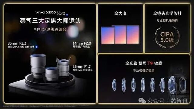 vivo X200 Ultra在影像方面堪称登峰造极,搭载了蔡司三大定焦大师镜头——14mm蔡司超广角镜头、35mm蔡司人文纪实镜头和85mm蔡司APO超级长焦镜头II,并实现了全大底、全镜头光学防抖以及全新升级蔡司T*镀膜。