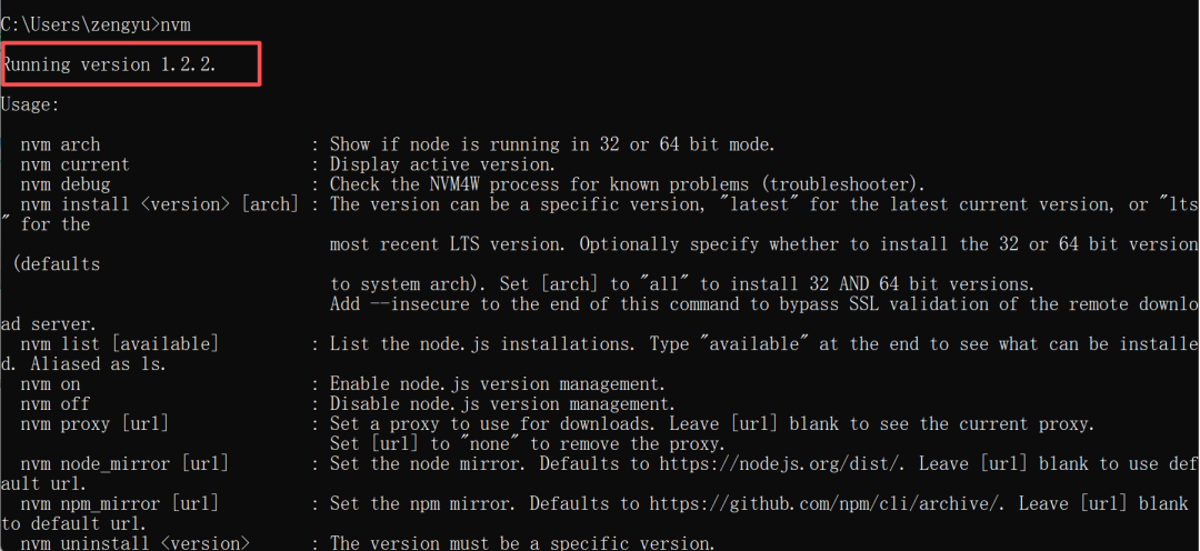 安装完成之后,就可以使用nvm看看是否会输出以下信息,如果有显示,就说明安装nvm管理器成功
