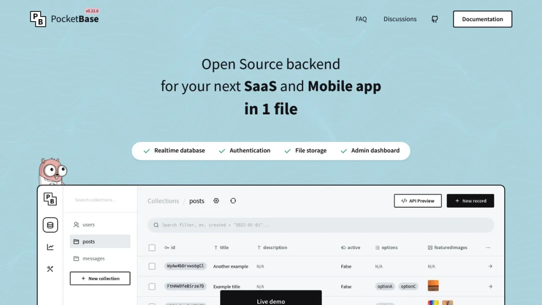 PocketBase是一个由嵌入式数据库(SQLite)、实时订阅、内置身份验证管理、便捷的管理仪表板和简单 REST API 组成的开源后端。它本质上是一个极简的、可本地部署的 Backend-as-a-Service (BaaS) 解决方案,目标是让开发者,尤其是前端或全栈开发者,能够瞬间获得一个功能完备的后端,从而将精力完全聚焦于业务逻辑和用户体验。