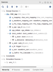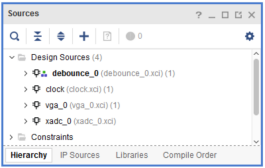 5.4 同样的,依次在IP Catalog窗口中添加debounce、vga和xadc三个IP,使用默认IP设置,无需另外配置,并且Generate Output Products,完成后Sources窗格中如下图所示: