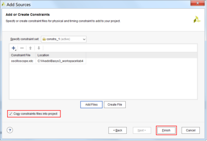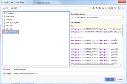 7.4 找到约束文件路径Basys3_workshop\sources\lab4\Src\Constraint,选中并添加‘oscilloscope.xdc’文件;