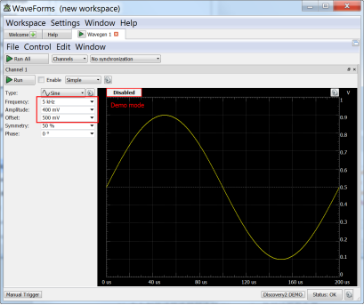 3) 根据本实验示波器设计的输入标准,将波形幅值设置为400mV,直流偏移量设置为500mV,输入的频率可以选择为100H~5kHz之间