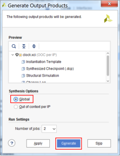 5.3.5 弹出Generate Output Products窗口,在Synthesis Options中选择‘Global’,点击‘Generate’继续。