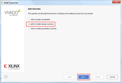 6.2 在导向窗口中选择‘Add or create design sources’,点击Next继续