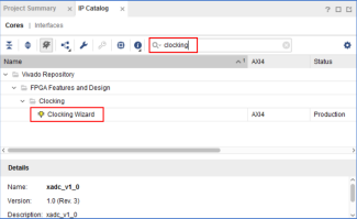 5.2 在右侧IP Catalog窗口的搜索框中搜索‘clocking’,双击‘Clocking Wizard’开始配置IP;