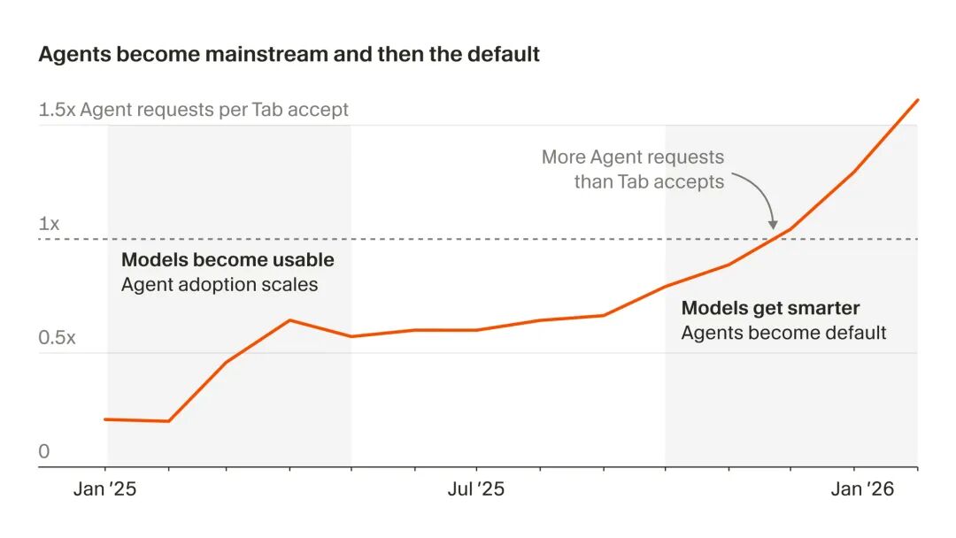 这种转变是如此彻底,以至于今天许多Cursor用户从未触碰过Tab键。2025年3月,我们的Tab用户数量大约是智能体用户的2.5倍。现在情况反转了:我们的智能体用户数量是Tab用户的2倍,Cursor中的智能体使用量激增。