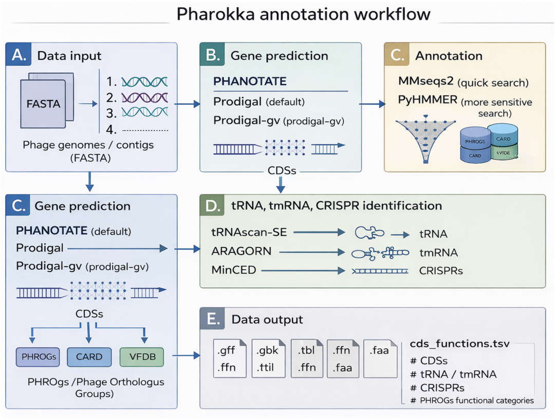 Hello,Hello小伙伴们大家好,近年来,随着高通量测序技术的发展,越来越多的噬菌体基因组被解析,噬菌体组学研究也逐渐成为微生物生态和环境病毒学的研究热点。然而,噬菌体基因组注释与传统细菌或古菌基因组注释有显著差异,现有的通用注释工具在准确性和流程集成方面都存在一定局限,难以满足高通量、标准化的研究需求。今天给大家介绍一款专为噬菌体基因组开发的自动化注释工具——Pharokka。