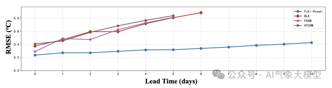 ▪ 即使对FuXi-Ocean输出进行日内平均(保守处理,会牺牲部分精度),其海表温度RMSE仍稳定优于多组传统模式基线。