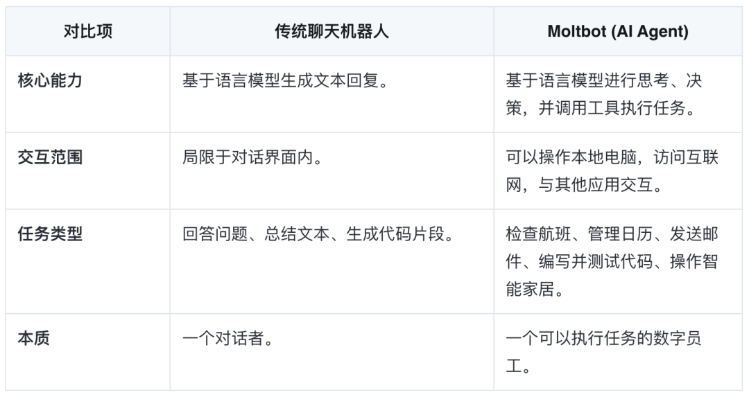 Moltbot 与普通聊天机器人的最大区别在于它引入了 Agent(代理)和 Tools(工具)的概念,这赋予了 AI 超出纯文本交流的能力。