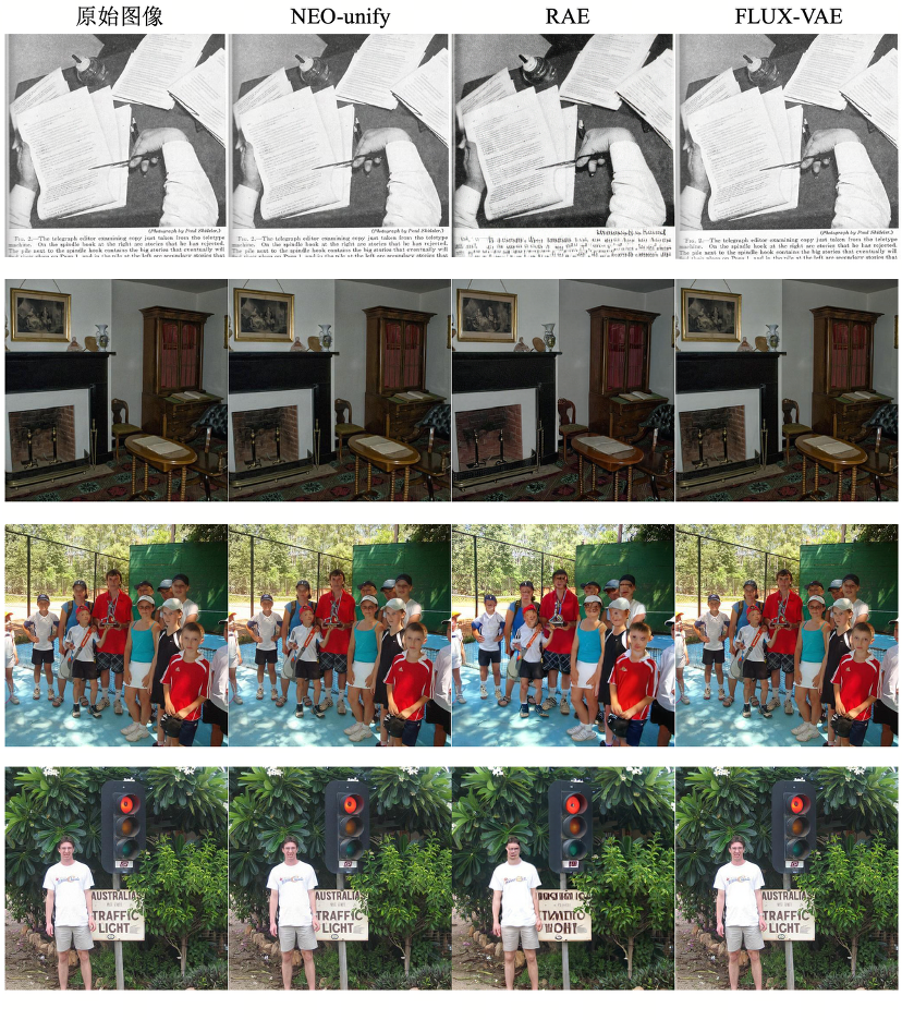 基于这一发现,我们训练了 NEO-unify(2B)。在初步 9 万步预训练后,模型在 MS COCO 2017 上取得 31.56 PSNR 和 0.85 SSIM,而 Flux VAE 的对应指标为 32.65 和 0.91。这一结果表明,即使不依赖预训练 VE 或 VAE,近似无损的原生输入仍能够同时支持高质量的语义理解与像素级细节保真。