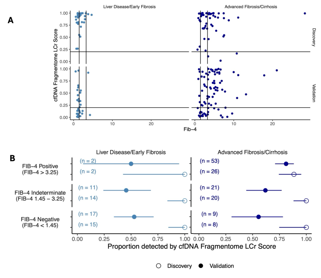 在超声检测肝硬化、血液检测纤维化指标(FIB-4指数)与cfDNA片段组学方法的头对头分析中,FIB-4指数在发现队列中检出48%的晚期疾病患者,在验证队列中检出64%的晚期患者,cfDNA片段组学方法的检出率分别为94%和73%。在疾病早期阶段观察到的不同诊断方法之间的差异更为显著。在发现队列中,FIB-4指数能识别出6%的早期疾病患者,在验证队列中为7%;基于cfDNA片段组学方法在该阶段的识别率分别为100%和50%。