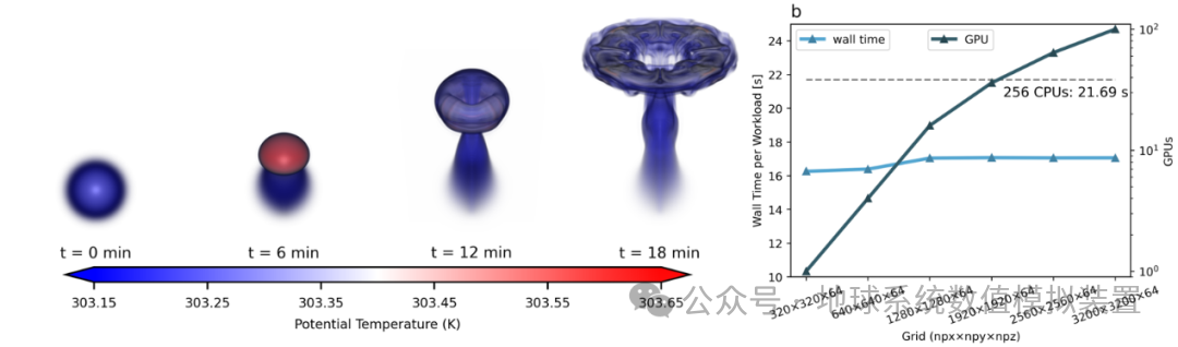 图3:左图为将二维的Robert连续热泡实验拓展到三维的模拟结果,以此来进行大规模网格的异构计算扩展性测试。右图为在不同GPU数量下,保持每GPU工作负载不变时的单位工作负载墙时间,虚线为256个CPU核心在相同任务规模下的计算时间基准。