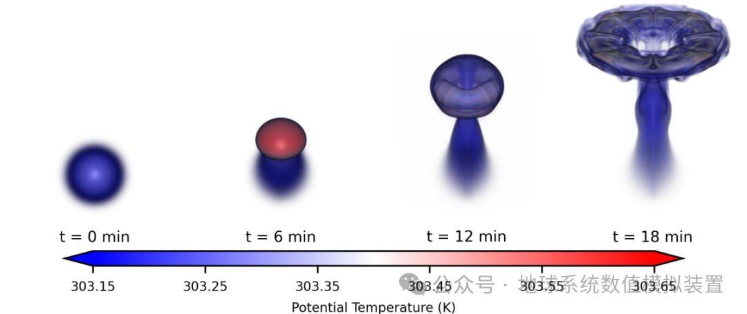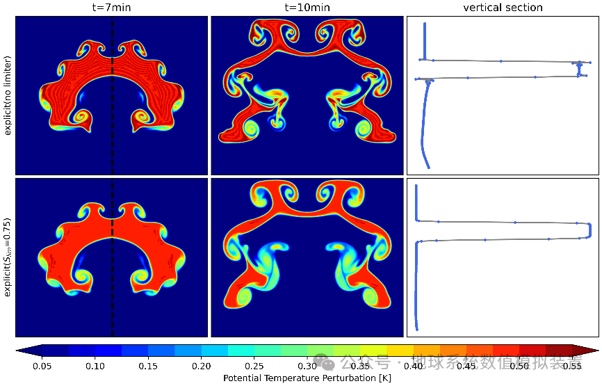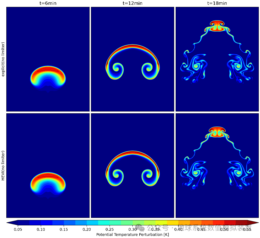 图2:Robert连续热泡实验。上方为显式方案结果,下方为使用垂直隐式求解器的结果,第1~3列为不同时刻的模拟结果。