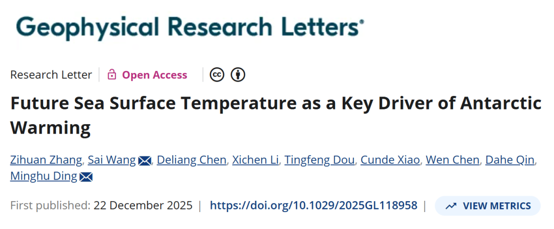 Zhang, Z., Wang, S.*, Chen, D., Li, X., Dou, T., Xiao, C., Chen, W., Qin, D. & Ding, M.* (2025). Future sea surface temperature as a key driver of Antarctic warming. Geophysical Research Letters, 52(24), e2025GL118958. https://doi.org/10.1029/2025GL118958
