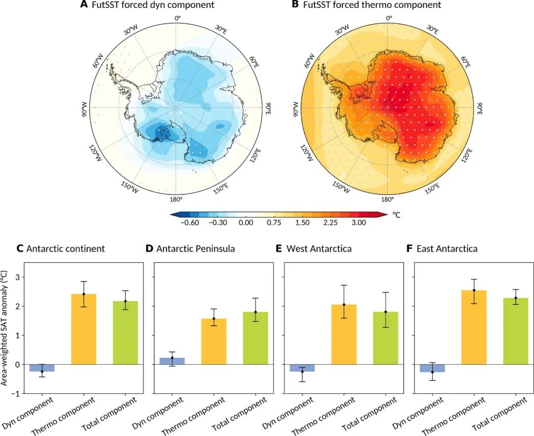 在物理机制上,海温上升通过热力学与动力学两类过程影响南极气温。动力学过程主要表现为南半球环状模正向增强,对南极大部分地区产生冷却效应;而热力学过程则通过海洋向大气释放感热与潜热,直接驱动近地表增温。研究表明,在未来变暖背景下,热力学作用将在整体气温响应中占据主导地位,进而推动南极地区呈现显著的增暖放大效应(图2)。
