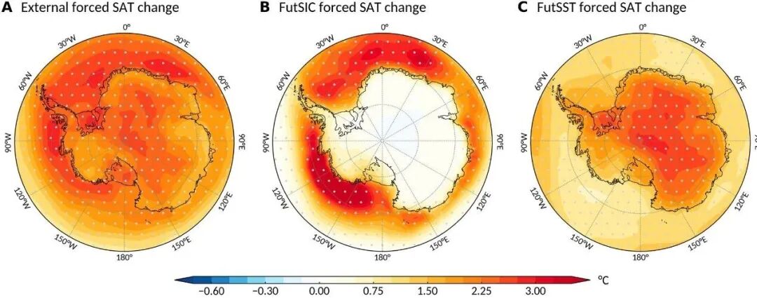 图1. 未来2°C增暖情景下南极地区的气温响应。(a)外部强迫,(b)海冰强迫,(c)海温强迫。