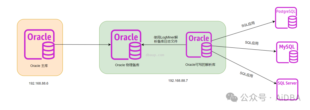 此架构很简单,一个Oracle主库(简称A库),一个物理备库(简称B库),一个可读可写的Oracle库(简称C库),B和C在同一台机器上,这样的话,C库就可以通过LogMiner+平面文件字典的形式实时的解析B库的在线和归档日志,最后将解析出来的SQL通过简单转换,可以应用的其他的PG、MySQL、SQL Server等库。