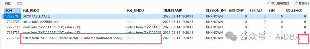 接下来就是,在自己的环境中做了很多实验,发现不会只包含一个ROWID,都是这种情况:delete from "SYS"."AABB" where "ID" = '3' and ROWID = 'AAAUU4AABAAAc4DAAF';,且SQL_UNDO列都是有值的,而出现问题的删除语句的SQL_UNDO列是空的,这就比较奇怪咯。