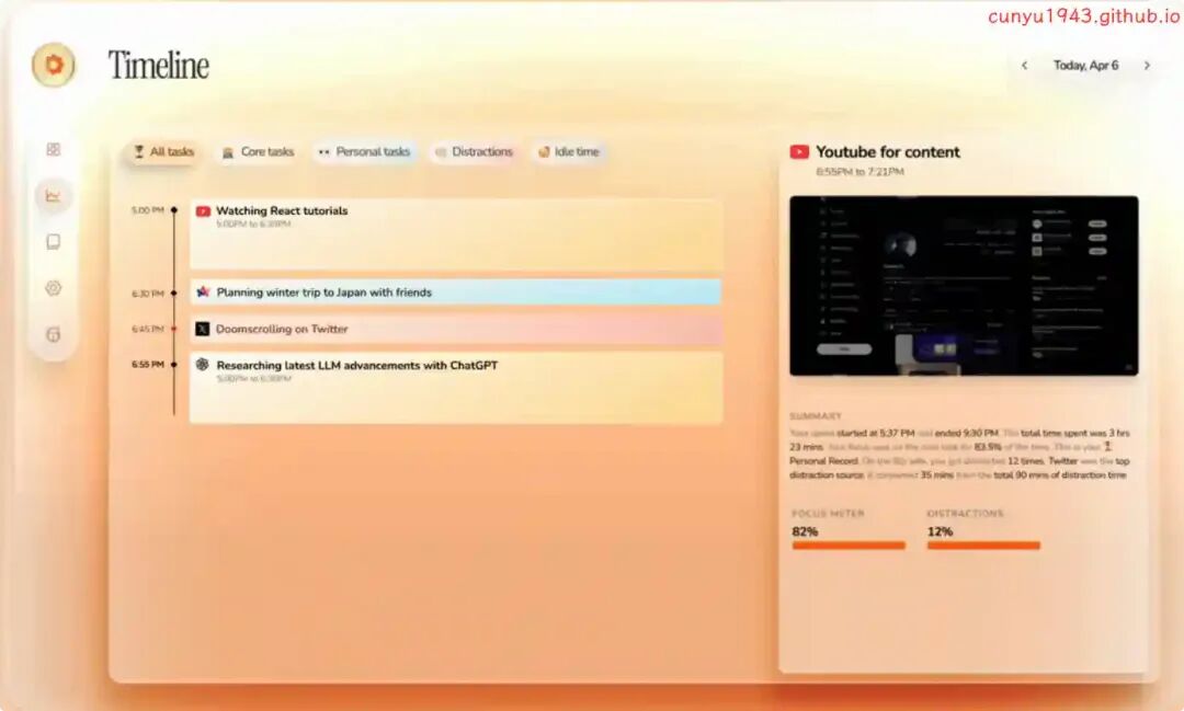 一款用于记录你在 macOS 上活动时间线的原生程序,它以每秒 1 帧的速度记录你的屏幕,每 15 分钟用 AI 进行分析,并生成一个带有摘要的活动时间轴。