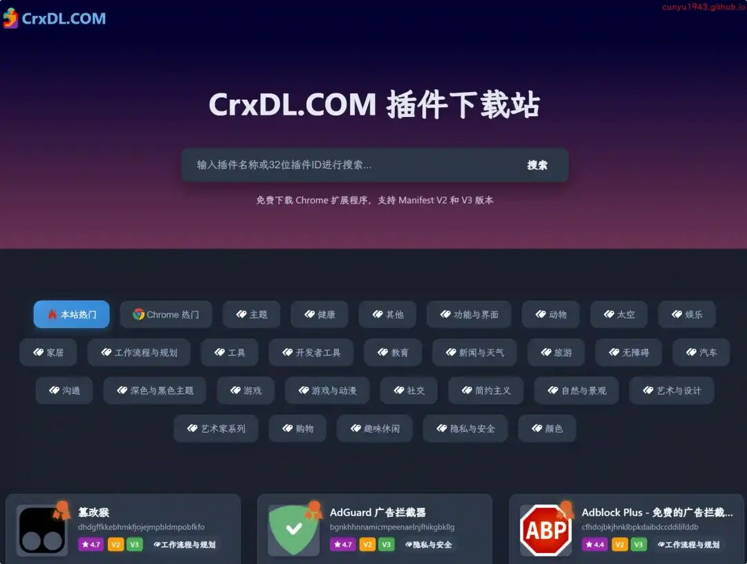 免费下载 Chrome 插件扩展程序,支持 Manifest V2 和 V3 版本,提供丰富的插件分类和搜索功能。