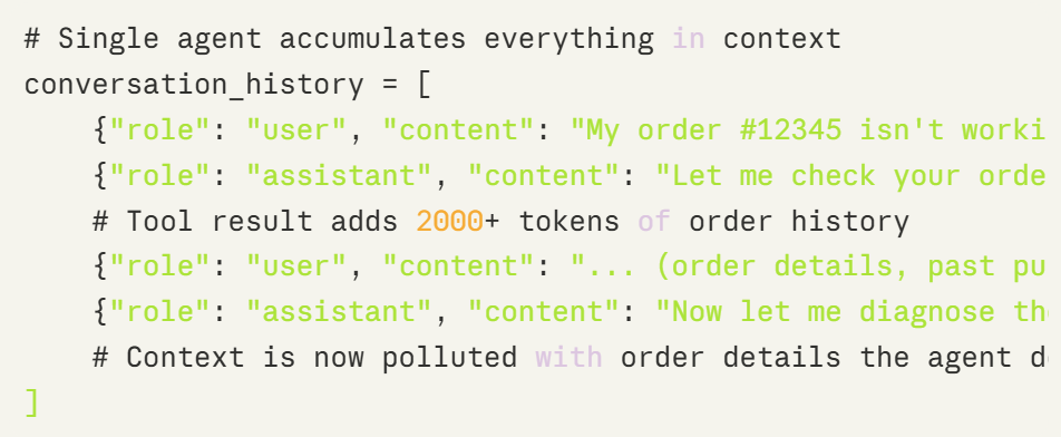设想一个客户支持智能体,它需要在诊断技术问题的同时检索订单历史。如果每次订单查询都向上下文中添加数千个 Token,智能体对技术问题的推理能力就会下降。