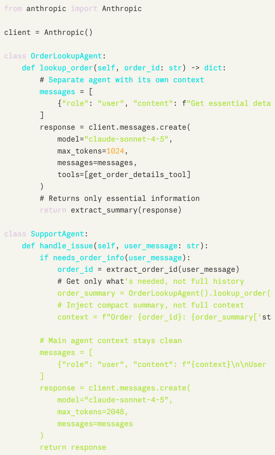 订单查询智能体处理完整的订单历史并提取摘要。主智能体仅接收其实际所需的 50-100 个 Token,使上下文保持聚焦。