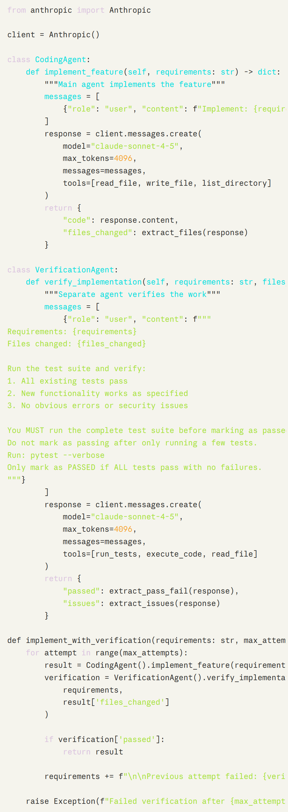 4 明确指令:指令“在标记为通过之前,你必须运行完整的测试套件”至关重要。如果没有对全面验证的明确要求,验证智能体往往会走捷径。