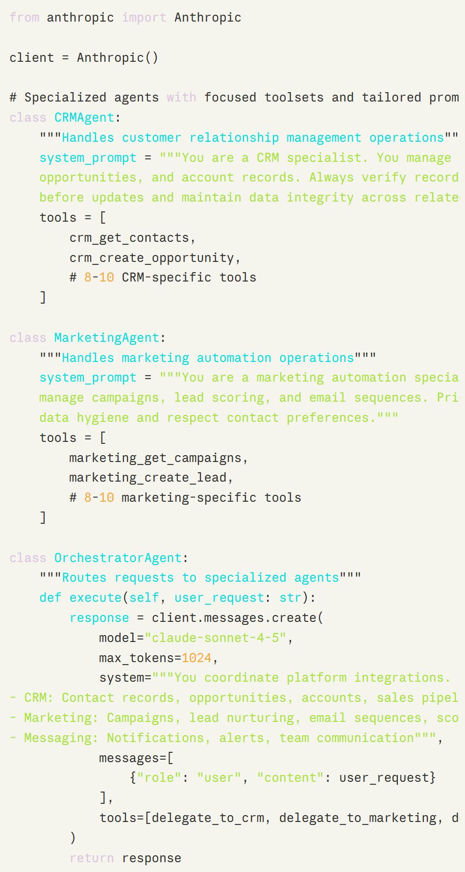 示例:多平台集成。考虑一个集成系统,智能体需要跨 CRM、营销自动化和消息平台工作。每个平台都有 10-15 个相关的 API 端点。