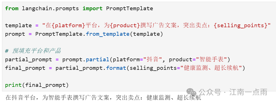 template = "在{platform}平台,为{product}撰写广告文案,突出卖点:{selling_points}"