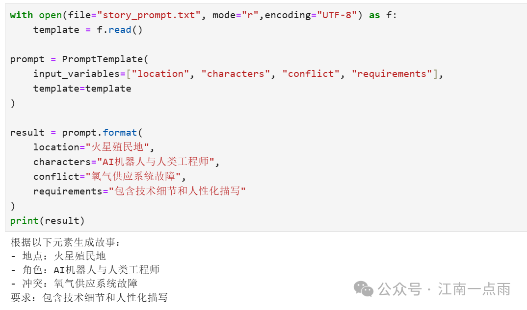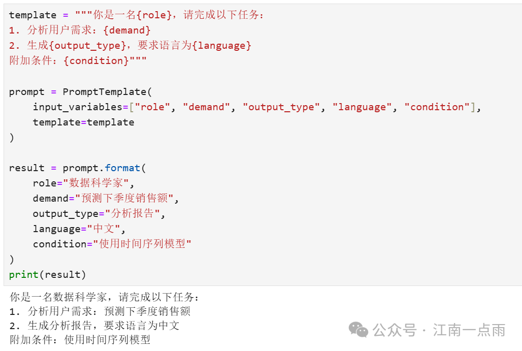 通过占位符 {} 动态插入变量,生成标准提示词。