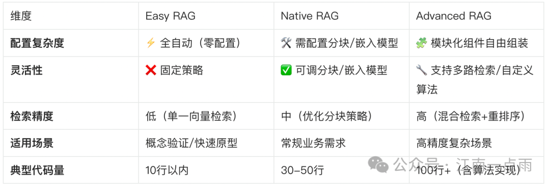 • 测试 Demo 或内部工具 → Easy RAG • 企业知识库系统 → Native RAG • 金融/法律专业问答 → Advanced RAG