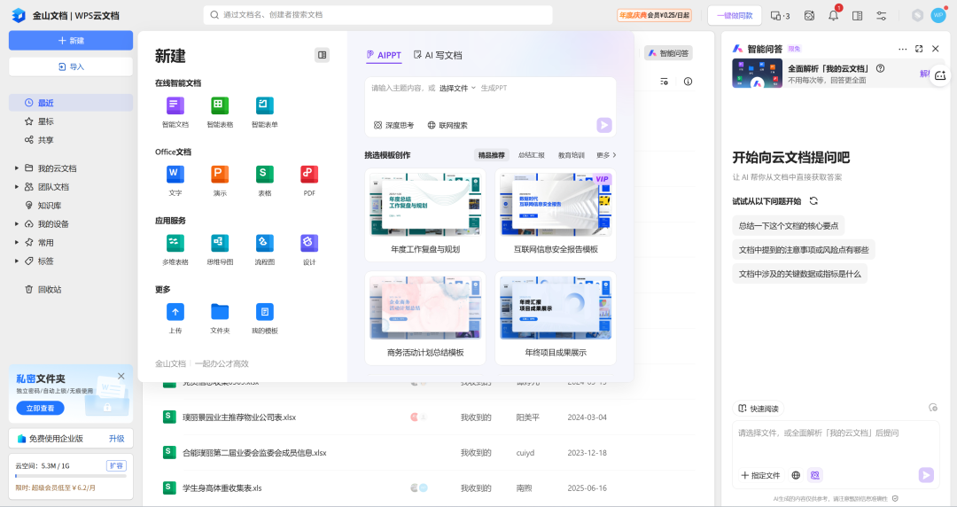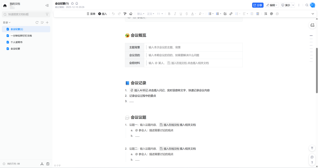 语音转写: 支持会议录音实时转文字,并直接生成文档内容。
