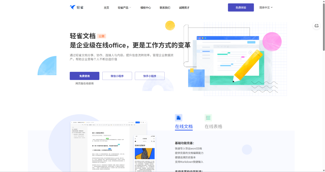 腾讯推出的多人协作在线文档平台,最大的优势在于与微信、QQ生态的无缝打通。说是不要注册,实际要其它号登录,可以直接通过微信扫码即可使用。