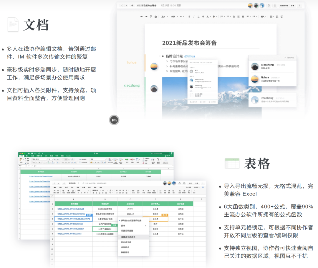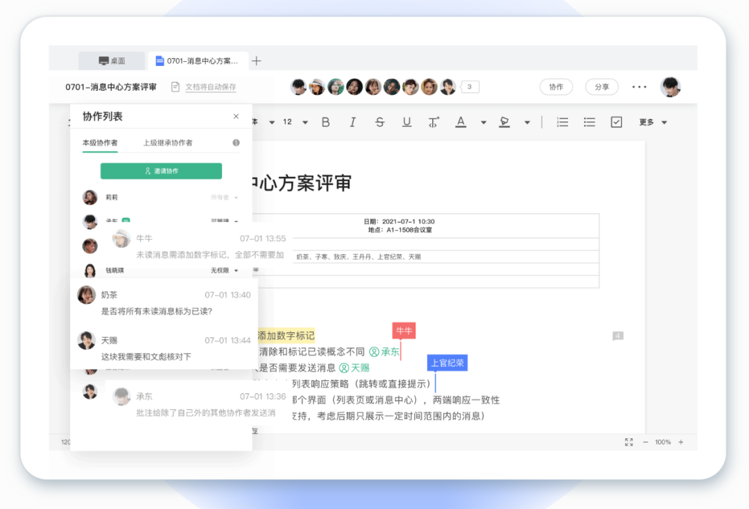 文档内互动: 选中任意内容即可评论或@同事,即时通讯与文档合二为一。