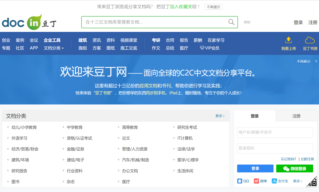 豆丁网(Docin)是全球优秀的C2C文档销售与分享社区。豆丁允许用户上传包括:pdf、doc、ppt、txt在内的数十种格式的文档文件,并以Flash Player的形式在网页中直接展示给读者。简而言之,豆丁就如同文档版的Youtube。每天都有数以万计的文档会上传到豆丁,正基于此,豆丁将致力构建全球最大的中文图书馆。