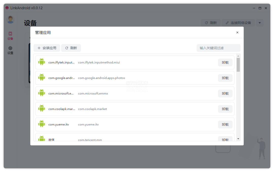 在手机的应用管理上,可以直接在电脑上卸载手机里的软件,支持使用用关键词快速搜索应用,也支持把电脑上的安装包传到手机里进行安装。