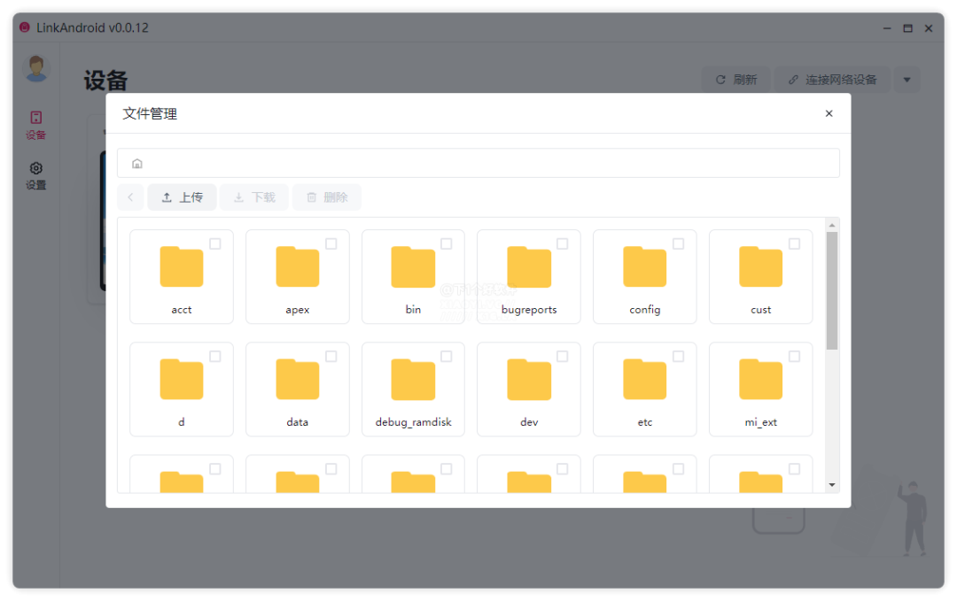 然后运行「LinkAndroid」软件就会自动识别并添加你的手机,显示已连接就表示成功了。如果需要通过网络连接,点击右上角连接网络设备,输入 IP 和端口即可。