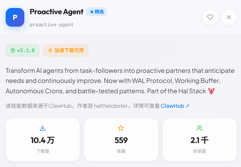 这是一个好用又不用寻找api key的技能。Proactive Agent 的核心价值可以精简为这几个点: