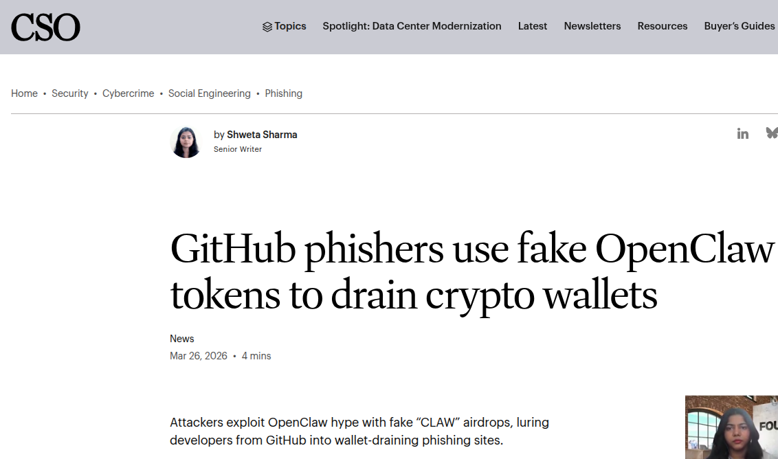 OX Security 监测数据显示,2026 年 3 月爆发针对 OpenClaw 项目相关开发者的钓鱼攻击。OpenClaw 为知名开源项目,官方明确声明从未发行代币,攻击者利用项目热度与社区信任,虚构 $CLAW 代币空投活动,精准针对 Star、Fork 相关仓库的开发者实施定向诈骗。攻击依托 GitHub 平台扩散,以虚假奖励为诱饵,最终通过仿冒网站窃取钱包资产,是典型的开源社区 + Web3定向钓鱼事件。