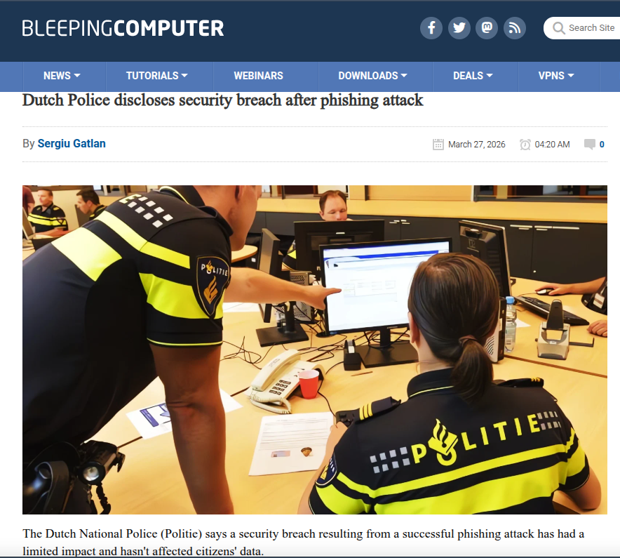 荷兰国家警方于 2026 年 3 月 27 日披露钓鱼攻击导致的安全入侵事件,攻击者通过高仿真钓鱼邮件成功获取内部系统访问权限,警方 SOC 快速响应并切断访问通道,官方通报未造成公民数据与侦查信息泄露,已启动刑事调查。而在 2024 年 9 月,荷兰警方曾遭遇国家级网络攻击,导致大量警员姓名、邮箱、电话及部分隐私信息泄露,事件调查仍在进行。半年内两起安全事件,反映执法机构面临的威胁烈度与防御压力持续上升。