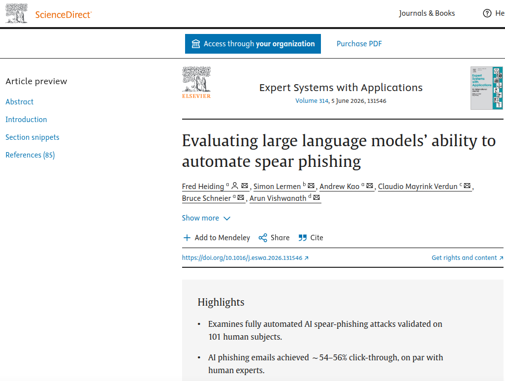 现有研究多聚焦 AI 生成内容的文本特征,缺少端到端自动化攻击链实证、人机对比量化数据、防御效能严格测试及经济激励分析。本文以 Heiding 等 2026 年权威实验为核心依据,设置四组对照、多模型横向测评、成本收益建模,完整揭示 LLM 在鱼叉式钓鱼中的进攻 — 防御 — 经济三重效应,并给出可部署检测代码与治理框架。研究结论可为安全设备厂商、企业安全团队、监管机构提供决策支撑。