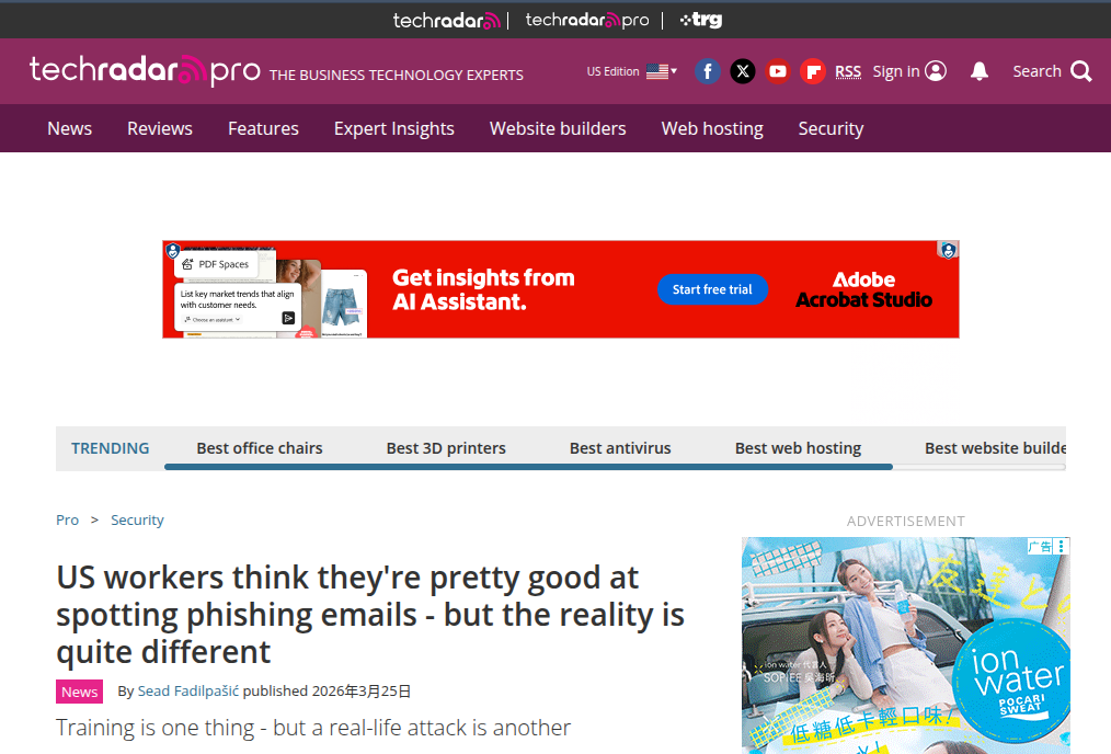 80% 员工自信能识别钓鱼邮件,真实测试通过率仅 32%,差距高达 48 个百分点,反映普遍的能力幻觉。