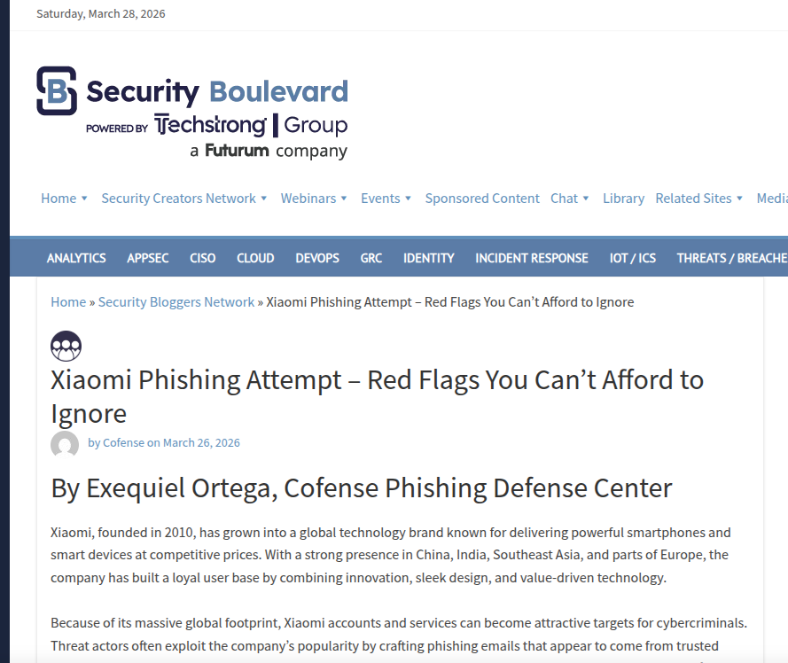 2026 年 3 月 26 日,Cofense Phishing Defense Center 发布预警:攻击者批量发送仿冒小米官方的钓鱼邮件,以新认证审核、24 小时权限到期为诱饵,诱导用户点击恶意链接,进入高仿小米账号登录页面,窃取账号密码用于非法登录与数据窃取。