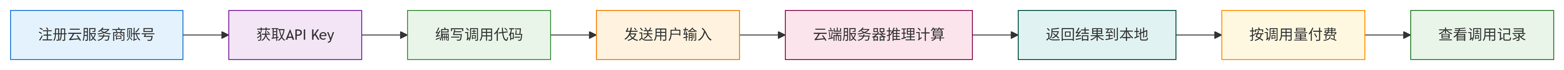 云端调用的核心,是把“推理”环节放在云服务商的服务器上完成,用户只需要负责“输入”和“接收输出”。下面是详细的执行流程,同样用流程图展示,再拆解说明。